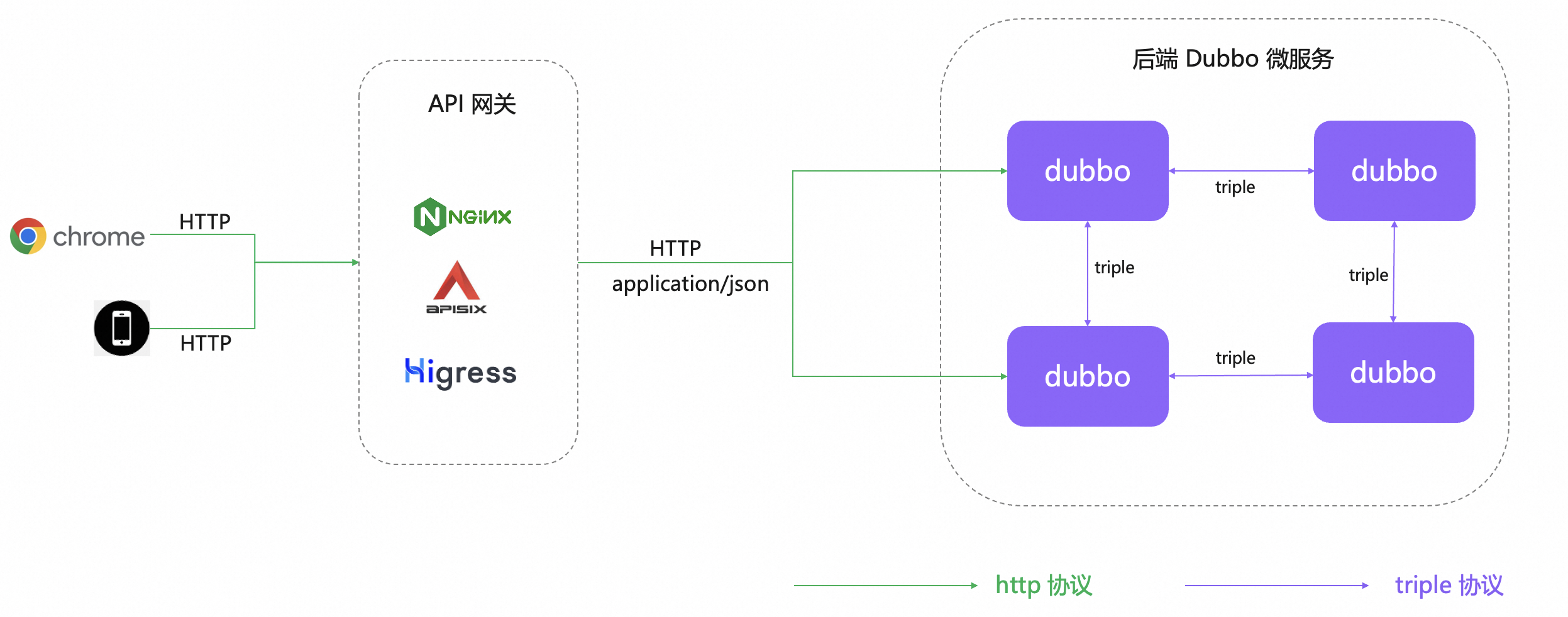 http -> dubbo 协议转换等步骤,任何主流的网关设备都可以通过 http 流量直接访问后端 triple 协议服务。